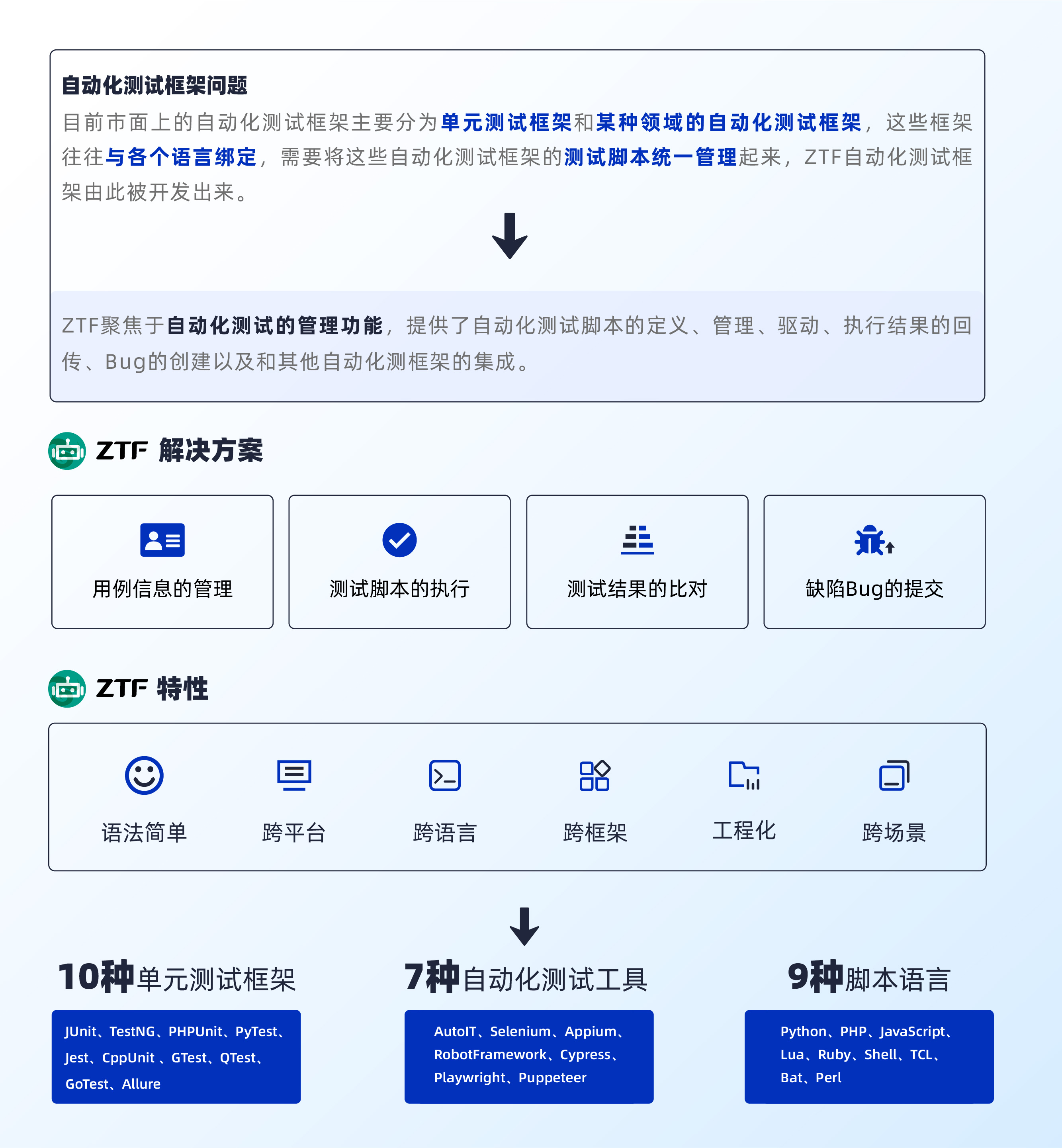 ZTF自动化测试框架对您现有的测试脚本资产没有侵入,可很好地驱动9种脚本语言、10种单元测试框架、7种自动化测试工具来编写和执行脚本,并把最终结果回传给禅道,进行统一的报告展示,打通项目管理和持续集成工具之间的沟壑。